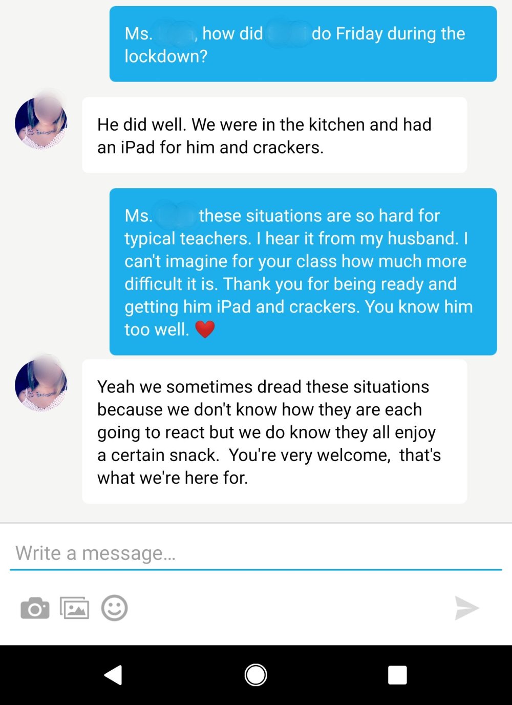 This past Friday, the school informed all parents that there would be an active shooter drill. I can’t imagine what these teachers go thru during these drills. ππAnd then add special need students? That must be so much harder. We are so blessed to have such a great teacher that understands our son and knows how to help him in these situations.