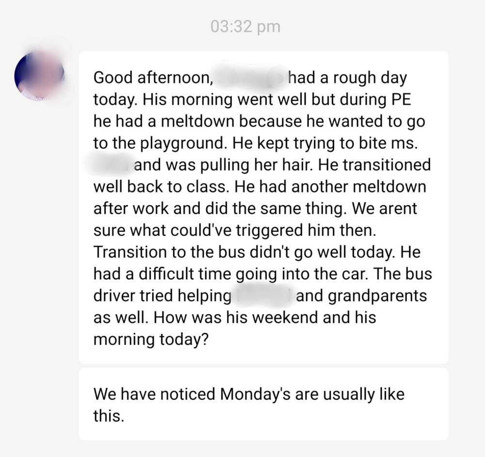 Today was a rough day. School speech therapist also emailed me to let us know he struggled a lot during his session too. My parents said the monkey kept hitting himself against the wall outside of school because he didn’t want to get inside my parents’ car.