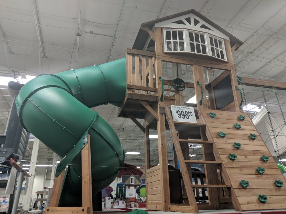 We went to Sam’s today to buy some pool supplies. While we are looking at the chlorine tablets, the monkey started to get out of the shopping cart. We didn’t notice that on top of the pool supplies was a playground set.