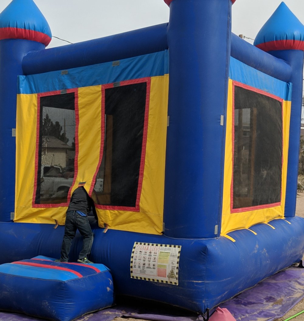 Little by little he’d go outside, then back inside the house. He finally had the nerve to touch the bouncy house then he’d run back inside. One of the times he poped his head inside the bouncy house and ran back inside the house. He was scared but he kept trying.