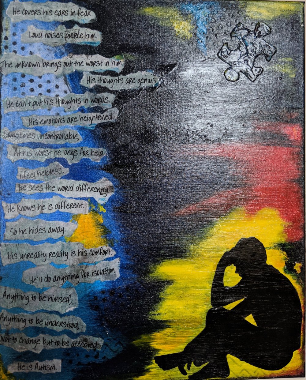 My husband went to an autism event with his students. There were different vendors and he saw this piece and he thought of me. I absolutely love it. In the back, the artist dedicated it to me with the message, “From one autism mom to another. 💙”It reads: