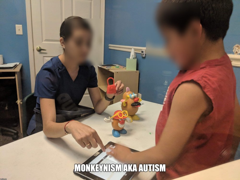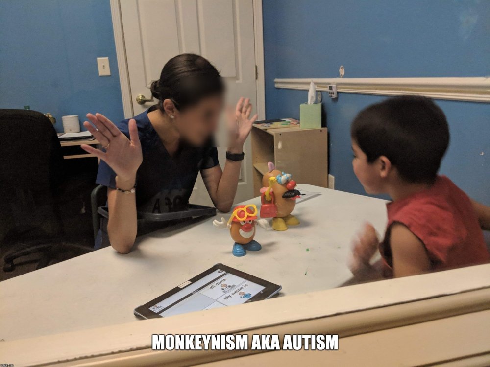 Today I came in to my little guy’s speech therapy session. I could see from the viewing room why she was so excited about. I had not seen it but I now, I understand how important this was to her. She pushed him and she refused to give up on him. She shows love and understanding even when our monkey is having a bad day.