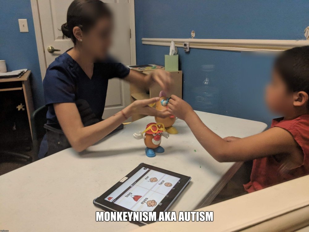 Last week as my son and I were leaving OT therapy, she was driving away and she saw us. She pulled over and came running with a big smile. She told me that the monkey had finally engaged with Mr. Potatoe head and with another similar toy. She was so happy telling me this and I was moved to see how much celebration she was bringing to this accomplishment. I smiled and told her how great that was to hear.