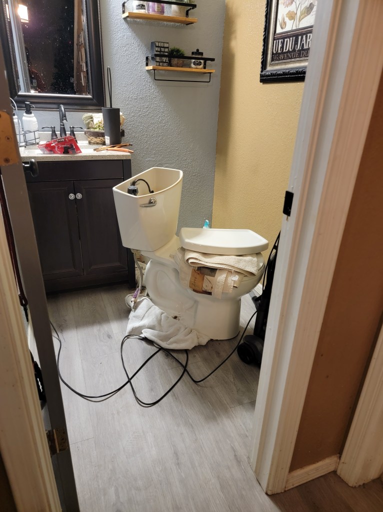 So what are we doing at 2 a.m. while everyone is asleep? Cleaning all the water on our floor. Then removing the entire toilet to try to get the plastic that’s stuck in there.